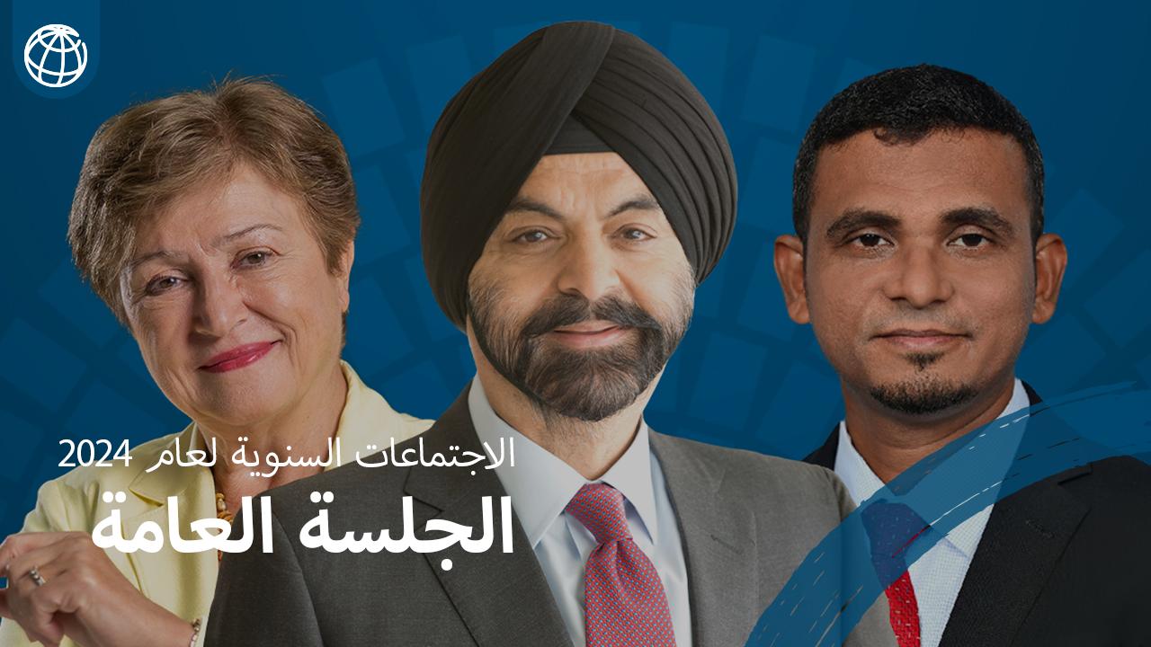 يتحدث كل من رئيس الاجتماعات السنوية ومحافظ سلطة النقد في المالديف أحمد منور، ورئيس مجموعة البنك الدولي أجاي بانغا، والمدير العام لصندوق النقد الدولي كريستالينا غورغييفا في الجلسة العامة للاجتماعات السنوية في واشنطن العاصمة في 25 أكتوبر/تشرين الأول.